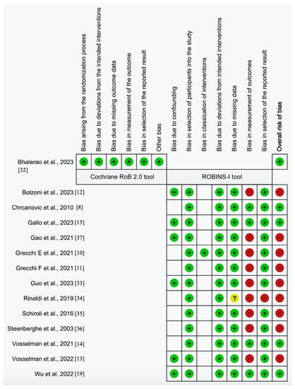 As the primary outcomes were measured using the same scale, the bias was summarized at the study level (Figure 2). Only one study [32] was evaluated using the Cochrane RoB 2.0 tool, which showed no serious concerns regarding its items, resulting in a low overall risk of bias. Regarding the thirteen included studies evaluated using the ROBINS-I tool, there were serious concerns regarding bias in measuring outcomes. Most studies did not report who conducted the accuracy assessment [10,11,12,13,33,34,35,36,37] or did not provide transparent reporting [19], potentially influencing their results. Additionally, the Rinaldi study should have reported a statistical analysis plan [34], raising additional concerns about bias in selecting reported results and potential issues with missing data. Finally, confirming essential information from Wu’s study helped clarify the risk of bias [19]. Regarding the secondary outcomes, there were no concerns regarding bias, as they were evaluated using a clinical, binary, and straightforward method, which reduced the chance of systematic error in their assessment.