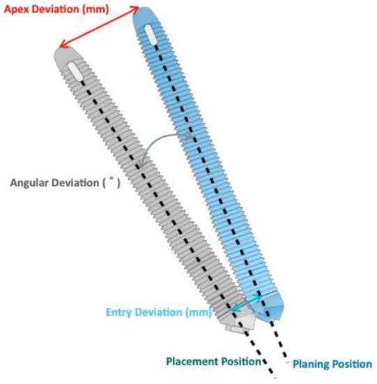 The deviation outcomes between the planned and placed positions were evaluated and described in two ways: two-dimensional (2D) and three-dimensional (3D) (Figure 3). Out of the 14 included studies, 12 studies analyzed the deviation outcomes using 3D measurements [10,11,12,13,14,19,32,33,34,35,36,37]. In contrast, two studies used 2D measurements [8,15]. The deviations reported in each study are summarized in Table 2. For the 2D measurements, Gallo et al. measured the linear differences at the entry and apex of the implant in the X-axis, Y-axis, and Z-axis directions, respectively [15]. The angular deviation between the planned/placed ZIs was determined in terms of yaw, pitch, and roll of the long axis of each implant. On the other hand, Chrcanovic et al. only measured the angular deviation between the planned/placed ZIs in the anterior-posterior view and caudal-cranial view of each implant [8].