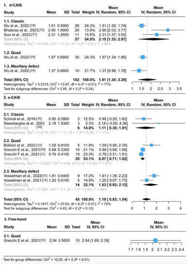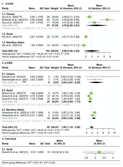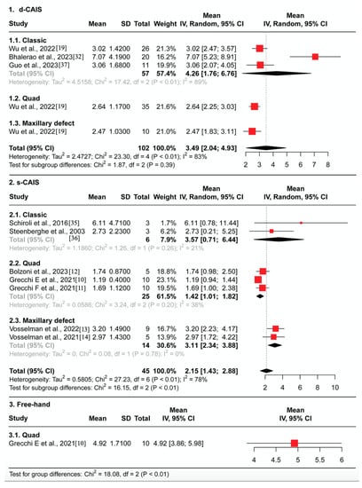 A qualitative and quantitative synthesis of the included studies was performed. When possible, patient-level data were combined following the recommendations of the Cochrane Collaboration. The quantitative synthesis involved pooling the results from subsamples within the studies. Given the expected diversity between the studies (clinical heterogeneity), a single-mean random-effects meta-analysis using restricted maximum likelihood was chosen to pool the study results. The analysis produced a relative measure expressed as an overall mean and its corresponding 95% confidence interval (CI). Since no comparative studies were identified in the previous searches, an indirect comparison between d-CAIS, s-CAIS, and free-hand approaches was conducted using the chi-square test (p < 0.05). Heterogeneity was assessed using the chi-squared test (p < 0.1), and the I2 test was used to determine the proportion of variability attributed to between-study heterogeneity. A subgroup analysis was conducted based on the ZI protocol, specifically classifying studies as classic, quad zygoma, or maxillary defects approaches. The outcomes were presented according to the subgroup analysis or as a measure of the overall effect (p < 0.1 or p > 0.1 from the test for subgroup differences, respectively).
