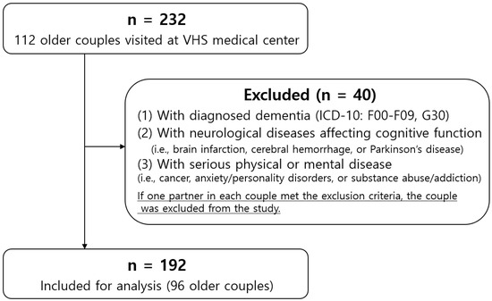 This study is a hospital-based survey conducted at the Veterans Medical Research Institute in the Veterans Health Service Medical Center in Seoul, Korea. The Veterans Medical Research Institute has researchers, places, and equipment to conduct interviews and medical examinations for clinical studies. A total of 232 participants (116 couples) volunteered between 29 March and 30 September 2021. Among these patients, those included in the study were patients who: (1) visited the Department of Neurology with complaints of cognitive decline; (2) had no difficulty or inability in performing daily activities, including doing heavy and light housework, shopping, preparing meals, and managing money; (3) were able to complete a neuropsychological evaluation and questionnaires independently; and (4) had agreed to participate in this study. If both partners in each couple met the inclusion criteria, they were included as the target population. Those excluded from the study were patients who: (1) had been diagnosed with dementia (ICD-10: F00-F09, G30) and other neurological diseases affecting cognitive function (i.e., brain infarction, cerebral hemorrhage, or Parkinson’s disease); and (2) were currently suffering from a serious physical or mental disease or diseases (e.g., cancer, anxiety/personality disorders, or substance abuse/addiction). The inclusion and exclusion criteria for clinical conditions were evaluated by experienced neurological clinicians. If one partner in each couple met the exclusion criteria, the couple was excluded from the study. Forty participants were finally excluded if they had dementia, neurological disorders, serious physical/mental diseases, or their spouse was suffering (Figure 1). Our study population was 192 participants (96 couples).
