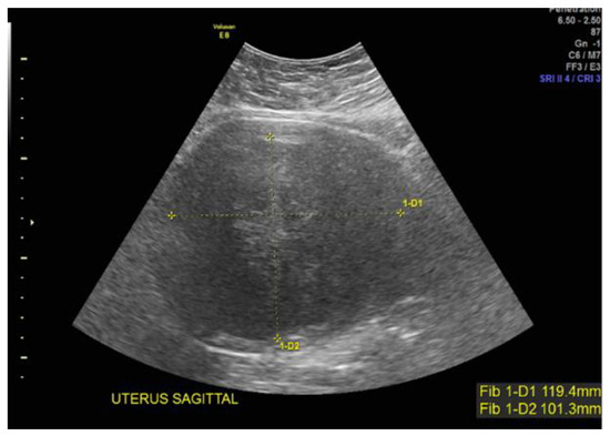 Figure 4A). AdditionalUFs, including subserosal ones, were noted. The patient underwent a myomectomy with exploratory laparotomy, confirming a leiomyoma with