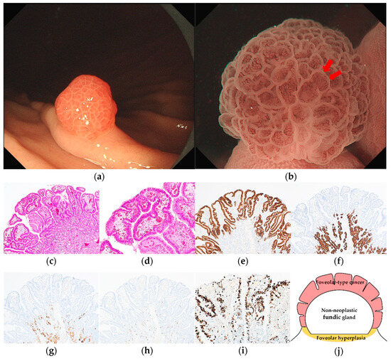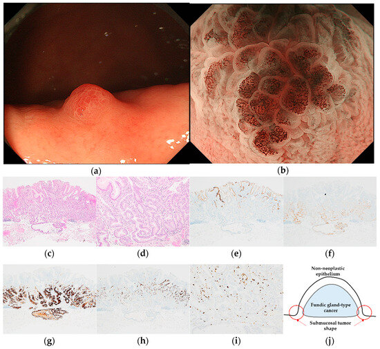 - Ueyama, H.; Yao, T.; Akazawa, Y.; Hayashi, T.; Kurahara, K.; Oshiro, Y.; Yamada, M.; Oda, I.; Fujioka, S.; Kusumoto, C.; et al. Gastric epithelial neoplasm of fundic-gland mucosa lineage: Proposal for a new classification in association with gastric adenocarcinoma of fundic-gland type. J. Gastroenterol. 2021, 56, 814–828. [Google Scholar] [CrossRef]