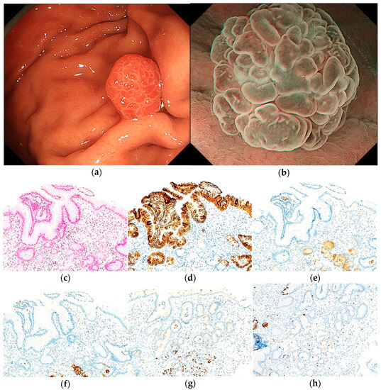 - Isono, Y.; Baba, Y.; Mukai, K.; Asakawa, H.; Nose, K.; Tsuruga, S.; Tochio, T.; Kumazawa, H.; Tanaka, H.; Matsusaki, S.; et al. Gastric adenocarcinoma coexisting with a reddish semipedunculated polyp arising from Helicobacter pylori-negative normal gastric mucosa: A report of two cases. Clin. J. Gastroenterol. 2018, 11, 481–486. [Google Scholar] [CrossRef]
