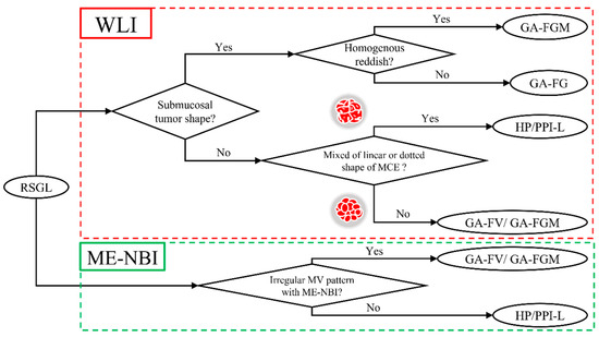 - Muto, M.; Yao, K.; Kaise, M.; Kato, M.; Uedo, N.; Yagi, K.; Tajiri, H. Magnifying endoscopy simple diagnostic algorithm for early gastric cancer (MESDA-G). Dig. Endosc. 2016, 28, 379–393. [Google Scholar] [CrossRef] [PubMed]
