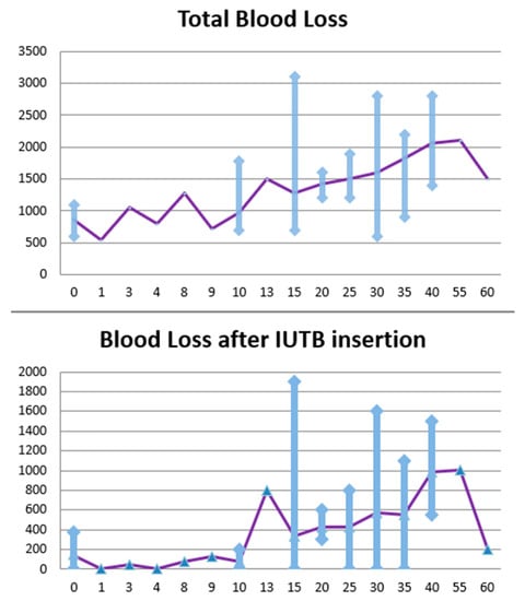 Association between blood loss and IUTB time insertion. The blue triangle are the averages and the purple line is the line to see the evalution of the average. The blue lines veticales lines are the range of values.