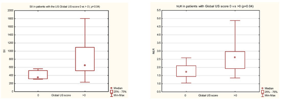 The SII value was significantly higher in patients with the Global US score > 0 vs. score = 0 (649.3 (516.7–1093.4) vs. 349.6 (316.5–520.5), p = 0.04) (Figure 1).