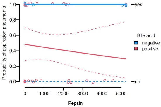 Furthermore, the analysis showed that the correlation between bile acid values and the diagnosis of aspiration was not prominently evident. The red-color-coded dots representing bile acid values were spread across the measuring range, indicating no clear association between bile acid levels and the diagnosis of aspiration. As presented in Figure 3, for patients with negative bile acid, the confidence band extended over the entire range, indicating maximum uncertainty in the prediction. Despite this, all patients with negative bile acid results had a positive clinical diagnosis of AP. In patients with negative bile acid, there were cases with both positive and negative AP diagnoses, and this pattern was consistent across different pepsin values. The number of cases with positive and negative diagnoses was roughly the same, indicating that the probability of a positive AP diagnosis for patients with positive bile acid was approximately 50%. Furthermore, the logistic model also resulted in the following p-values for the relationships between pepsin and bile acid with the diagnosis: pepsin, p = 0.53; bile acid, p > 0.99. Therefore, knowledge of pepsin (p = 0.53) did not significantly improve the estimation of the probability of diagnosis, when compared to knowledge of bile acid (p = 0.52).