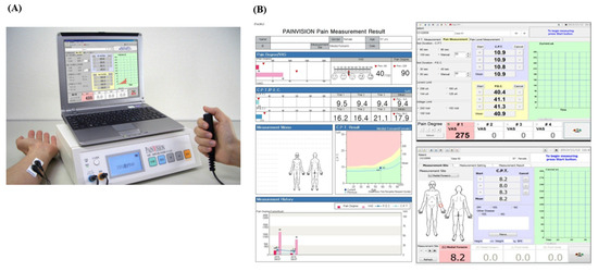 PainVisionTM (PS-2100, supplier: Nipro, maker: Osachi Corporation, Osaka, Japan) (Figure 1) is an equipment designed to quantitatively assess a patient’s pain by converting it into a heterogeneous sensation using electric stimuli. The pain degree is calculated and notated as two parameters: the current perception threshold (CPT) and the pain equivalent current (PEC). The CPT is defined by the lowest electrical current at which the patient detects the stimuli [19]. The PEC is defined by the lowest electrical current at which the patient detects the pain. The quantified pain degree (QPD) is calculated with the following equation: QPD = (PEC − CPT)/CPT × 100. By digitizing pain assessment (especially evaluation of central sensitizing pain) and treatment progress, it is easier to adjust dosage of analgesic drugs and share a patient’s “pain” with other physicians. Further, it also can be used for the early diagnosis of neuropathic pain ahead of subjective symptoms. This non-invasive and quick test proved to be an objective screening method for diabetic peripheral neuropathy in busy clinics, ensuring adherence to the current unfulfilled recommendations for annual assessments for all diabetic patients [20].