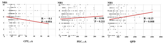 Correlations between the NRS and CPT, QPD, and PEC for all subjects. The scatter diagram shows a negative correlation between the NRS and CPT but a positive correlation between the NRS and QPD for all patients. NRS: numeric rating scale; CPT: current perception threshold; PEC: pain equivalent current; QPD: quantified pain degree.