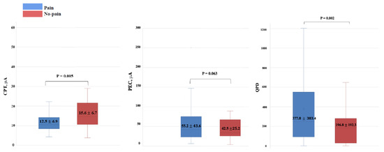 The secondary analysis was conducted using the Pain and No-pain groups depending on the presence or absence of pain (Table 2). There were significant differences in the CPT and QPD between the Pain and No-pain groups (Figure 4).