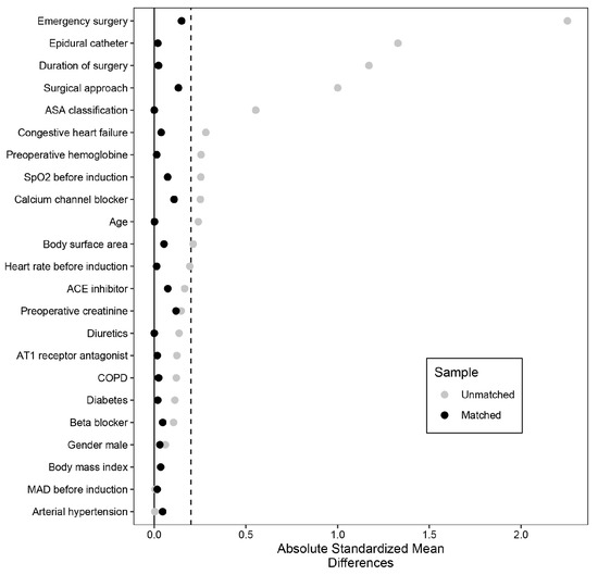 Covariate balance. Absolute standardized means were higher than 0.2 in the unmatched cohort in many variables and were shown to be below 0.2 after matching. ASA, American Society of Anesthesiologists; ACE, angiotensin-converting-enzyme; AT1, Angiotensin II receptor type 1. COPD, chronic obstructive pulmonary disease; MAD, mean arterial pressure.