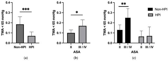 TWA below 65 mmHg in (a) non-HPI and HPI-treated subjects in matched cohort; (b) for all patients with ASA status II vs. III/IV in matched cohort; (c) for non-HPI and HPI subjects considering ASA status II vs. III/IV in matched cohort. TWA, time weighted average; ASA, American Society of Anesthesiologists; HPI, Hypotension Prediction index; * p < 0.05; ** p < 0.01; *** p < 0.001.