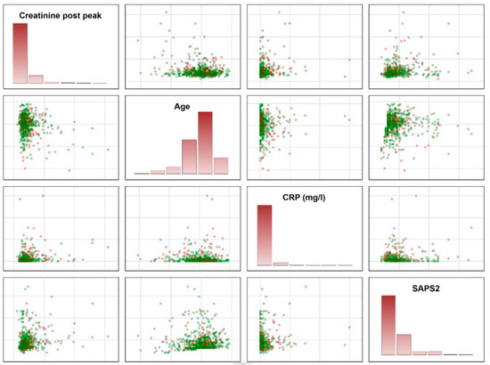 Illustration of the overlap between patients surviving and dying within 1 year. The figures demonstrate the need for a reject option, which was used to identify patients in the areas of overlap. Green circles represent the patients being alive after 1 year; the red circles show the patients dying within 1 year. It is impossible to make accurate predictions for patients in the overlap. These patients were identified using the final model and did not receive a prediction. CRP = C-reactive protein; SAPS2 = Simplified Acute Physiology Score (SAPS) II.