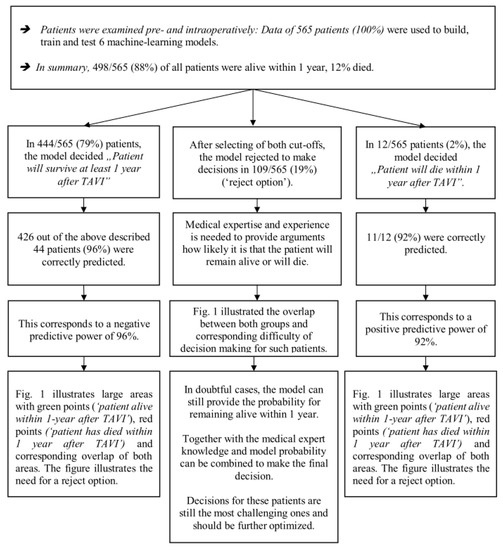 Strengths: The most important strength of this study is that it provides a prediction model for patients with TAVI with excellent accuracy to identify patients who will survive within 1 year. In addition, the models are not only theoretical concepts but can also be implemented in any database and are of practical use in the clinic to support the clinician’s decision. The large sample size of about 565 patients is also an important strength of the study because a large sample size is important for resulting in statistically sound models, as emphasized by mathematical statistics and ML theory. It is important that the models were 10-fold cross-validated in the learning sample and, after application of the reject option, also tested in an independent test sample to avoid overlearning and to provide accurate predictions when the models are confronted with new, previously unseen data (generalization to new data and model stability).