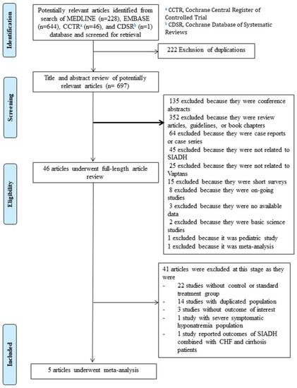 A total of 919 potential articles were retrieved by our search strategy (Figure 1), of which 222 were duplicated articles. We excluded 651 articles because they did not meet the inclusion criteria due to article type, methodology, or lack of relevance to both vaptans and SIADH. Therefore, 46 articles underwent full-length review. Forty-one articles were further excluded because of duplicated population, lack of controls, lack of outcome of interest, no subgroup analysis of SIADH patients, or it included a population with severe symptomatic hyponatremia. Only five studies with a total of 1840 patients were included in this systematic review and meta-analysis, consisting of three RCTs [37,38]. and two cohort studies [37,38].