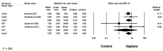 There were four studies that assessed serum sodium overcorrection [37,38,40,41]. Mostly, overcorrection was defined as an increase in the serum sodium level > 12 mmol/L over the first 24 h and >18 mmol/L over the first 48 h in three studies [38,40,41], whereas another study had a lower threshold for overcorrection defined as an increase in the serum sodium level >10 mmol/L over the first 24 h [37] (Supplementary Table S4). In this meta-analysis, the pooled incidence rates of overcorrection were 13.1% (95% CI 4.3, 33.6; I2 = 92%) in the vaptans group (Supplementary Figure S2) and 3.3% (95% CI 1.6, 6.6; I2 = 27%) in the control group (Supplementary Figure S3). Overall, there was a statistically significant increased rate of overcorrection with vaptans with a pooled OR of 5.72 (95% CI 3.38, 9.70; I2 = 0%) (Figure 4). Meta-analyses, based on the type of study, were additionally performed. Subgroup analysis by study design revealed a statistically significant increased rate of overcorrection with vaptans in cohort studies with a pooled OR of 5.92 (95% CI 3.44, 10.20; I2 = 0%). However, when solely including RCTs, this statistically significant increased risk of overcorrection with vaptans was not observed with a pooled OR of 3.22 (95% CI 0.35, 29.46; I2 = 0%).