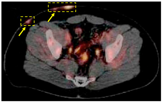 However, there are some limitations to using US imaging that PET scans can address. Distinguishing between small vasculature and developing sinus tracts, especially at the borders of HS lesions, is challenging for US imaging, which limits its effectiveness and accuracy in detecting the full extent of HS lesions [47,48]. Additionally, US imaging is operator-dependent and requires specialized training and experience in HS detection to achieve proficiency. Obtaining US images can also be time-consuming, making it challenging to incorporate it into clinical practice [49]. Moreover, HS patients may experience pain due to the physical contact required to obtain US images. Lastly, HS lesions can be deep-seated, and US imaging may not be able to penetrate the required depth, making it less useful, especially in larger patients [50]. FDG-PET scans can overcome these limitations and have a role in the diagnosis and management of HS patients, particularly in situations where US imaging is not feasible (Figure 2).