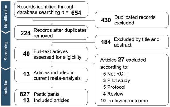 Figure 1 presents the flow chart and outcomes of our screening process. Our search strategy yielded a total of 654 articles, of which 430 duplicate articles were excluded. Subsequently, we conducted a thorough evaluation of the titles and abstracts of the remaining 224 articles. Following the application of our screening criteria, 184 articles were excluded, leaving us with 40 full-text articles for further analysis. From this set, 27 articles were excluded as they did not meet the criteria for being non-randomized controlled trials, pilot studies, protocols, reviews, or relevant outcomes. Ultimately, our meta-analysis included a total of 15 trials from 13 articles. Further information regarding the 27 excluded articles can be found in Supplementary Material S1.