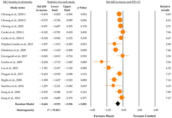 Forest plot of the effect of music on anxiety in dementia scores [,,,,,,,,,,,,].