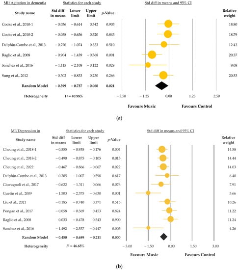 (a) Forest plot of MI to agitation in dementia; (b) Forest plot of MI to depression in dementia [,,,,,,,,,,].