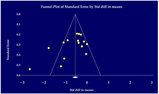Funnel plots for publication bias tests were conducted for all studies performed using CMA 3.0 software (Figure 4). Most studies were clustered at the right side of the effect size, while the left side was more dispersed. The majority of the studies were concentrated inside the diagonal line. This funnel plot features a study of MI for anxiety in dementia, which was examined using the “Trim and Fill” [] and Eggers tests [] to verify the publication bias. Egger’s test showed no significant publication bias in this research (intercept = −2.29, 95% CI = −5.84 to 1.26, t = 1.398, df = 13, 1st-tailed p = 0.093, 2nd-tailed p = 0.186).