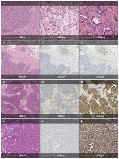 Pathology of selected colonic and extraintestinal tumors (10× magnification). First row: a diverse range of colon carcinomas observed over the years: (1a)—discohesive with rhabdoid features (2008), (1b)—mucinous with scattered signet-ring cells (2014), and (1c)—conventional low-grade (G2) adenocarcinoma (2014). Second row: sebaceoma of the scalp (2020): (2a)—tumor nests with basaloid cells and focal central sebaceous differentiation, (2b)—loss of nuclear MSH2 expression in tumor cells, and (2c)—loss of nuclear MSH6 expression in tumor cells. Third row: invasive high-grade urothelial carcinoma (2020): (3a)—irregular nests of the neoplastic urothelium, (3b)—loss of nuclear MSH2 expression in tumor cells, and (3c)—strong positive nuclear GATA3 reaction supporting the diagnosis of urothelial carcinoma. Fourth row: well-differentiated (G1) endometrioid carcinoma (2022): (4a)—confluent glands with back-to-back crowding, (4b)—loss of nuclear MSH2 expression in tumor cells, and (4c)—strong positivity for estrogen receptors characteristic of endometrioid carcinoma.
