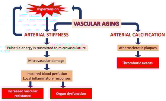 Vascular remodeling with advancing age is characterized by arterial stiffening and calcification (Figure 1). Arterial stiffening affects the macro- and micro-vasculature in unique ways. The main function of large arteries is to dampen the pulsatility of cardiac contraction by elastic recoiling after systolic expansion, so that constant, rather than pulsatile, blood flow is propelled to organs and tissues, including the coronary arteries. However, this buffering effect is lost as the aorta and its major branches stiffen in response to age, obesity, and other cardiometabolic diseases, and pulsatile energy is then transmitted to the delicate microvascular vessels of downstream organs and tissues. Microvascular damage can lead to impaired blood perfusion and local inflammatory responses, which can impair organ function and increase vascular resistance in the long term. The interdependence between hypertension and arterial stiffness, by which increased mean arterial pressure stimulates aortic wall maladaptive remodeling and further vascular stiffening, is particularly insidious as it establishes a detrimental feed-forward loop. The renal and cerebral vasculatures, which receive most of the cardiac output, are particularly sensitive to pressure pulsatility associated with arterial stiffness. Accordingly, a direct correlation between measures of arterial stiffness and cerebral and renal damage has been reported [7,8], underscoring the importance of targeted therapies to prevent arterial stiffness and, most importantly, associated target organ damage.