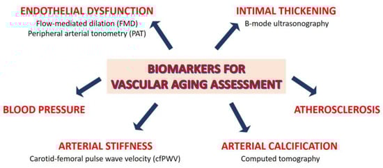 Biomarkers of biological aging include a variety of molecular and cellular factors, such as telomere length, epigenetic alterations, somatic mutations, gut dysbiosis, inflammatory and omic-based biomarkers [23]. These factors can be integrated with functional and structural ones, such as arterial stiffness, blood pressure, endothelial dysfunction, intimal thickening, atherosclerosis, and arterial calcification. In the last decades, various invasive and non-invasive methods have been proposed to measure vascular aging (recently reviewed in [13,24]), some of which are summarized in Figure 2.