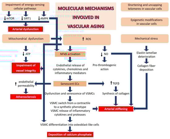 - Chronic low-grade inflammation: ROS activate nuclear factor (NF) kB, a transcription factor that orchestrates inflammation, resulting in endothelial release of cytokines, chemokines, and other inflammatory mediators. Indeed, age-related activation of inflammatory processes plays a key role in various macro- and micro-vascular disorders. Inflammatory cytokines re-shape endothelial function and promote senescence [67,68]. Moreover, endothelial cells (ECs) are one of the first cell types to become senescent with advancing age [67], promoting dysfunction and senescence of neighboring vascular cells, including VSMCs. Senescent ECs secrete transforming growth factor (TGF) β, which stimulates the synthesis of collagen and matrix metalloproteases [68], contributing to pathological remodeling of the vascular wall. Similarly, senescent VSMCs release pro-inflammatory factors such as IL6, leading to the activation of the IL6/STAT3 pathway which, in the setting of oxidative stress, stimulates the switch of VMSCs from a contractile to a synthetic phenotype [69,70] and consequent extracellular deposition of calcium phosphate. It has been estimated that VSMC-related mechanisms contribute ~50% to aortic wall stiffness with aging via an increase in the material stiffness of the aortic wall and/or vaso-actively regulating the aortic diameter.