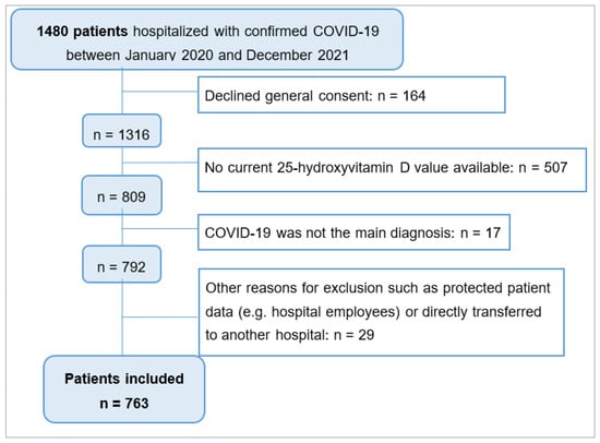 The study population included 763 patients hospitalised for COVID-19 with a current 25-hydroxyvitamin D status available (Figure 1). Out of 1480 patients, 763 patients were included, whereas 717 patients were excluded due to several reasons (see Figure 1).