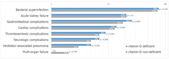 COVID-19-related complications in vitamin D deficient vs. non-deficient patients (shown in % per category, logarithmic scale).