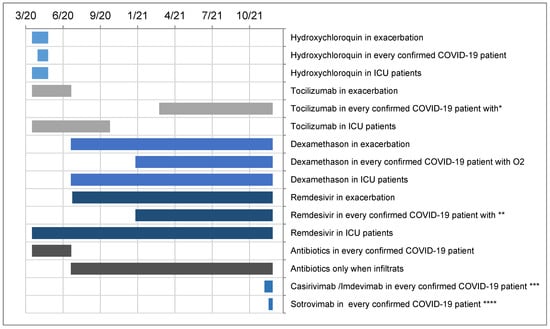 Additional organ support, such as vasoactive drugs, dialysis or extracorporeal membrane oxygenation, was provided in 59 patients (8%) (Table 6). All other therapies received are provided in Table 6. According to internal guidelines of the Cantonal Hospital Baselland, based on the Brigham and Women’s Hospital [] and National Institute of Health (NIH) guidelines [], different standard COVID-19 treatments were recommended at different time points of this pandemic (Figure 3).