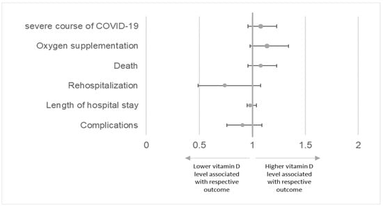 Odds ratio (or incident rate ratio 1) with 95% confidence intervals for different outcomes depending on serum vitamin D level (per 25 nmol/L increase), adjusted for age, sex, vitamin D supplementation, smoking status, comorbidities, vaccination status, and COVID-19 wave. Severe course of COVID-19 was defined as WHO category severe, critical or death. 1 Incident rate ratio for outcome length of hospital stay.