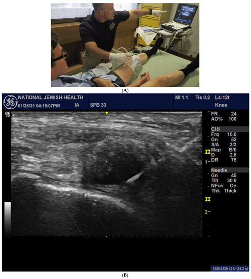 - Berkoff, D.J.; Miller, L.E.; Block, J.E. Clinical utility of ultrasound guidance for intra-articular knee injections: A review. Clin. Interv. Aging 2012, 7, 89–95. [Google Scholar] [PubMed]