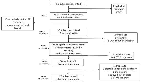 This single-center, open-label, prospective, investigator-initiated knee OA biomarker study (HS 3179, ClinicalTrials.gov accessed on 5 July 2023 NCT 04093232) was conducted with all subjects providing informed consent after Institutional Review Board approval. We recruited subjects from National Jewish Health (NJH) clinics, clinical trial notification web sites, and local radio advertisements. Exclusion criteria included age < 21 or >80 years, BMI > 40, pregnancy, knee surgery within one year, IA injectable therapeutics within 3 months, a history of systemic inflammatory or crystal arthritis, prior allergic reactions to chloroprep, lidocaine, or HA products, or any use of oral or systemic immunomodulatory therapeutics. Subjects were also required to ambulate for 6 min without the use of walking assistive devices, and the diagnosis of knee osteoarthritis was confirmed by a NJH study rheumatologist. Weight-bearing tibiofemoral joint radiographs were obtained within 1 year of their first study visit. These images were reviewed by a fellowship-trained musculoskeletal (MSK) radiologist for study inclusion based upon the presence of Kellgren-Lawrence (KL) grade II or III osteoarthritis [25]. Forty-nine eligible subjects had one knee aspirated between 2019 and 2021, and if an adequate SF volume of ≥0.5 mL was aspirated, they received the first of two intra-articular (IA) injections of an HA HYADD 4 (Hymovis® 24 mg/3 mL, Fidia Farmaceutici S.p.A., Abano Terme, Padova, Italy) and provided simultaneous peripheral blood samples.