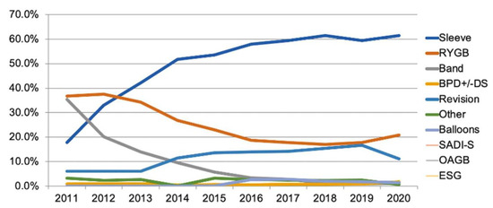 Bariatric surgery, specifically Roux-en-Y gastric bypass (RYGB), is highly effective for the treatment of GERD. The majority of bariatric surgeries are performed in BMIs of 35–55. GERD has been reported in as many as 62.4% to 73% of bariatric surgery candidates [47,48]. There has been an overall gradual increase in bariatric surgeries over the last two decades, with an increase from 43.5 per 100,000 to 70.6 per 100,000 from 2006 to 2009 and a subsequent plateau in bariatric surgeries from 2010 to 2015 [49]. Recent trends in bariatric surgeries performed are shown in Figure 1. There was a reduction in the overall volume of metabolic and bariatric surgeries that coincided with the COVID-19 pandemic due to the suspension of elective surgeries [10]. RYGB and sleeve gastrectomy (SG) are the most commonly performed bariatric surgeries [10,49]. There has been a significant increase in SG in recent years and it is the most widely performed bariatric surgery. In parallel, there was a steady decline in RYGB procedures at the end of 2012 and beginning of 2013, and a plateau in 2017, with an upward trend in 2019 and 2020. There has also been a large increase in minimally invasive bariatric surgeries compared to open bariatric surgeries [49].