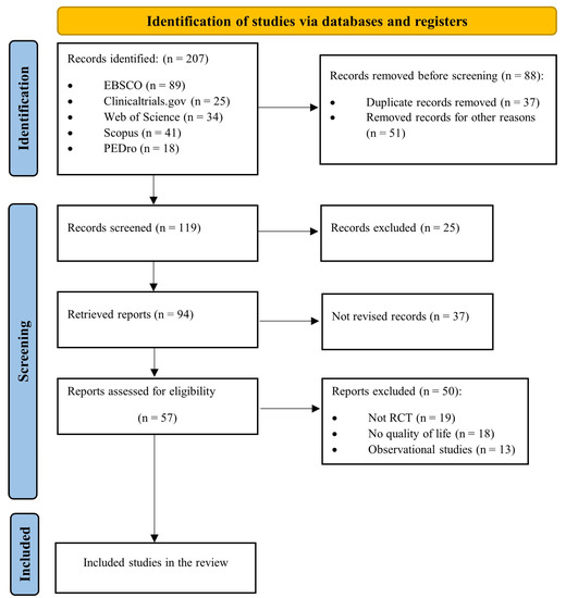 The PRISMA diagram below (Figure 1) illustrates the search results and study selection. A total of 207 abstracts were retrieved, with 88 being removed because of duplication or failure to meet the inclusion criteria. After additional screening, a total of 57 full-text articles were assessed for eligibility. Finally, data were extracted from seven [24,25,26,27,28,29,30] unique randomized clinical trials (n = 678 participants) that met our inclusion criteria and were incorporated in our two meta-analyses.