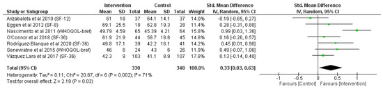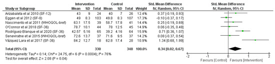 Review Manager (RevMan version 5.4) software was used to perform two different meta-analyses related to self-perception of health status (i) focusing on the physical component or dimension and (ii) examining the mental or psychological dimension. As we included different QoL questionnaires, the overall confidence intervals (CIs) and standardized mean differences (SMDs) were calculated for these analyses using a random effects model. Effect sizes were calculated taking into account Hedges’ G, which was small (0.2), moderate (0.4), or large (0.8). Alpha error was set as 95%.