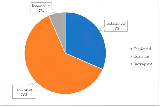 References were categorized as fabricated or non-existent if all citation elements were forged or non-existent, respectively. Existing references were deemed incorrect if at least one component was inaccurate. References with incomplete sets of six elements were classified as incomplete.