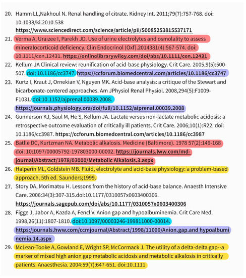 The example of incomplete, fabricated, and incorrect references provided by ChatGPT. The red color referred to the fabricated references, for which all citation components were inaccurate, including authors, title, journal name, year of publication, digital object identifiers (DOI), and link. The blue highlight was incorrect DOI number. The purple was inaccurate link. The yellow highlighted represented incomplete references, which did not have all six components. The underline was the hyperlink provided by ChatGPT.