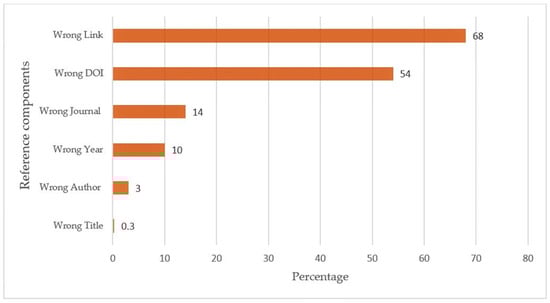 When we analyzed the accuracy of reference components, among the six components, an inaccurate link was the most common, noted in 68% of references, followed by DOI (54%), journal (14%), year (10%), author (3%), and title (0.3%) (Figure 4).