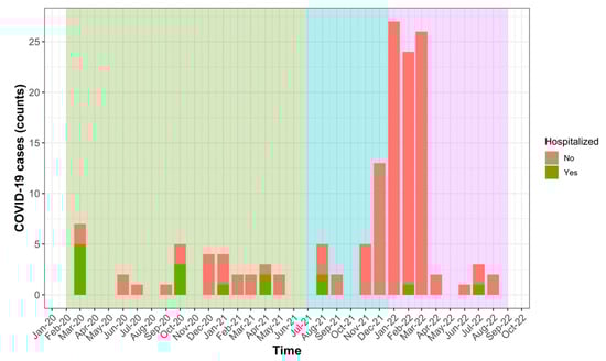 Figure 1 shows the number of COVID-19 cases observed over time among patients included in this study between March 2020 and August 2022. The figure also indicates how many cases required hospitalization and which SARS-CoV-2 variant was prevalent in Switzerland at the time of infection. The largest number of infections occurred during the intervals October 2020–April 2021 (n = 20 (13.9%), under Alpha variants) and November 2021–March 2022 (n = 96 (66.7%), under Delta and then Omicron variants).