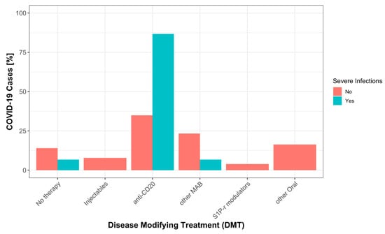 Percentage of severe and mild COVID-19 by DMT categories, as explained in methods: No therapy (no DMT), Injectables (interferons, glatiramer acetate), anti-CD20 (rituximab, ocrelizumab, ofatumumab), other MAB (alemtuzumab, natalizumab, tocilizumab), S1P-r modulators (fingolimod, ozanimod), other Oral (dimethyl fumarate, teriflunomide, cladribine, azathioprine, mycophenolate mofetil).