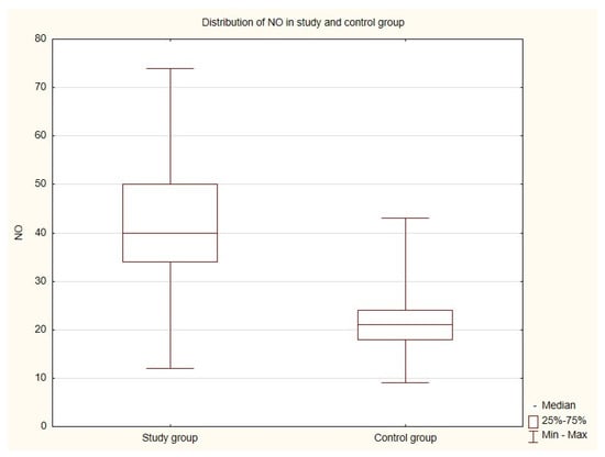 Comparison of NO values in the study group and the control group (Mann-Whitney U test—UMW test).