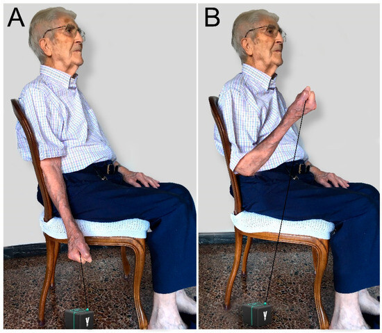 Power elbow flexion (PEF test) procedure. The procedure consists of assessing the power of elbow flexion using a linear encoder. For this, the subject was seated (A) and flexed the elbow as quickly as possible (B).