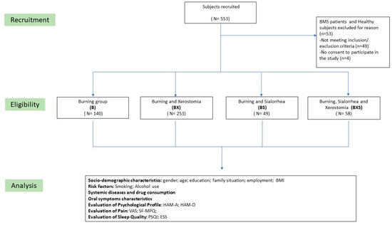 The patients were excluded if they suffered from diseases recognized as potential causative factors of BMS [20], were unable to comprehend or complete the questionnaires, had a history of psychiatric, neurological, or organic brain disorders, were undergoing treatment with psychotropic drugs or systemic medications potentially associated with oral symptoms, had a history of alcohol or substance abuse, had Obstructive Sleep Apnea Syndrome (OSAS), or had infectious, inflammatory, autoimmune diseases, or malignant tumors. In this study, a thorough evaluation was conducted to exclude any organic causes of hyposalivation in all BMS patients that reported salivary complaints. Multiple assess-ments were performed, including salivary flow evaluation, blood tests encompassing an immunological panel (Antinuclear Antibodies (ANA), anti-SS-A (anti-Ro) and anti-SS-B (anti-La), ultrasound imaging of the major salivary glands, brain MRI, and a meticulous clinical examination. These tests aimed to detect specific antibodies or markers associated with such conditions, providing valuable information for the exclusion of organic causes [21]. Moreover, we excluded patients suffering from muscle weakness or anatomical abnormalities leading to dysfunction in the coordination of the swallowing mechanism can lead to difficulties in swallowing, excess pooling of saliva in the oral cavity, and sialorrhea.