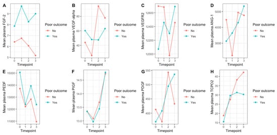 Line plots illustrating temporal changes in mean plasma angiogenic factor concentrations (A—FGF-2, B—VEGF-A, C—VEGF-R2, D—ANG-1, E—PEDF, F—PlGF, G—PDGF) and tcpO2 (H) at baseline and in three subsequent timepoints after PTA compared according to outcome status. A composite outcome of poor prognosis was determined based on the occurrence of at least one of the following: new ulcer formation, treated artery reocclusion/restenosis, limb amputation, the need for additional angioplasty, myocardial infarction, or all-cause death. VEGF-alpha—vascular endothelial growth factor alpha/A, VEGF-R2—vascular endothelial growth factor receptor 2, FGF-2—fibroblast growth factor 2, PlGF—placental growth factor, PDGF-BB—platelet-derived growth factor-BB, PEDF—pigment epithelium-derived factor, ANG-1—angiopoietin-1, tcpO2—transcutaneous oxygen pressure, timepoint 0—baseline, timepoint 1—24 h after PTA, timepoint 2—1 month after PTA, timepoint 3—3 months after PTA, poor outcome—new ulcer formation, treated artery reocclusion/restenosis, limb amputation, the need for additional angioplasty, myocardial infarction, or death.