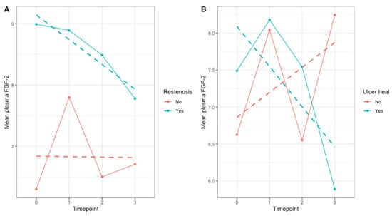 Lineplot illustrating changes in mean plasma FGF-2 stratified by restenosis/reocclusion (A) or ulcer status (B). Fixed points reflect mean values at a given timepoint, while dashed lines reflect a linear fit using a univariable model for time. Endpoint status is defined as occurrence of a given event after PTA according to restenosis/reocclusion of treated artery or ulcer healing during 12 months after PTA. Mean plasma marker values reflect the average over three timepoints. FGF-2—fibroblast growth factor 2, timepoint 0—baseline, timepoint 1—24 h after PTA, timepoint 2—1 month after PTA, timepoint 3—3 months after PTA.