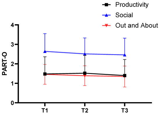 Mean values for PART-O Productivity, Social, and Out and About subscales for the total sample of patients with TBI at baseline (T1), four months (T2), and 12 months (T3) follow-up.