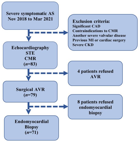 The inclusion criteria were patients who were undergoing AVR for severe AS [defined as aortic valve area (AVA) ≤ 1 cm2 or AVA index ≤ 0.6 cm2/m2, as determined by echocardiography], age > 18 years, and ability to undergo a CMR scan and to sign consent to the study protocol. The exclusion criteria were severe valve disease other than AS, significant CAD (>50% lesion in any epicardial coronary artery), history of myocardial infarction, estimated glomerular filtration rate <30 mL/min/1.73 m2, CMR-incompatible devices, persistent atrial tachyarrhythmias, and previous cardiac surgery. The main reasons for non-eligibility were significant CAD, renal dysfunction, and other valvular abnormalities. Of the 83 participants, 79 underwent surgical AVR and 4 postponed surgeries due to the COVID-19 epidemiologic situation. (Figure 1).